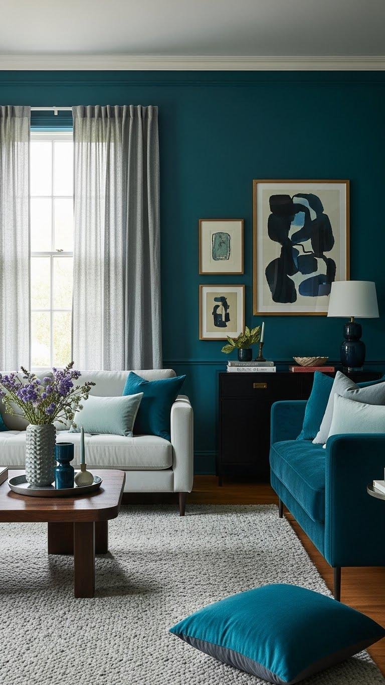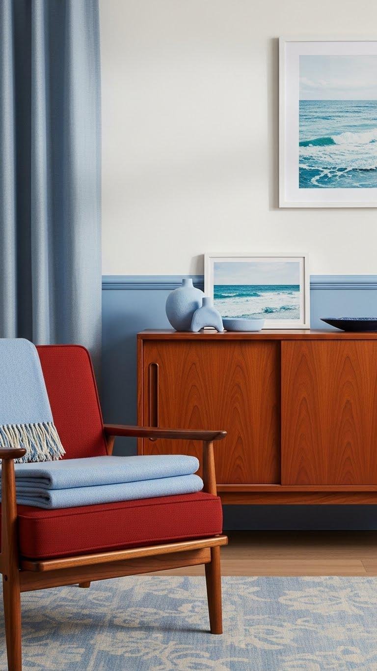 Bring in soft blues to cool and center a palette anchored by warm reds and woods; they act as a gentle foil that restores equilibrium without dulling the drama.