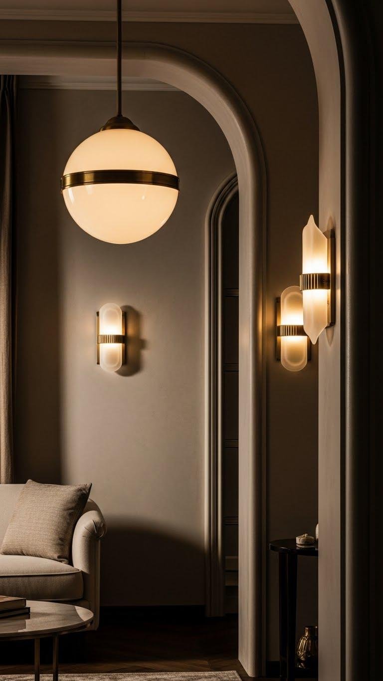 After you’ve layered warm metallics to create that soft, luxurious glow, let vintage Art Deco lighting add architectural drama and period poise to the scheme. You’ll pick fixtures like a vintage globe pendant or frosted sconces to sculpt light, emphasize curves, and free your rooms from blandness. Balance scale and finish for a bold, liberated look that feels both curated and effortless.