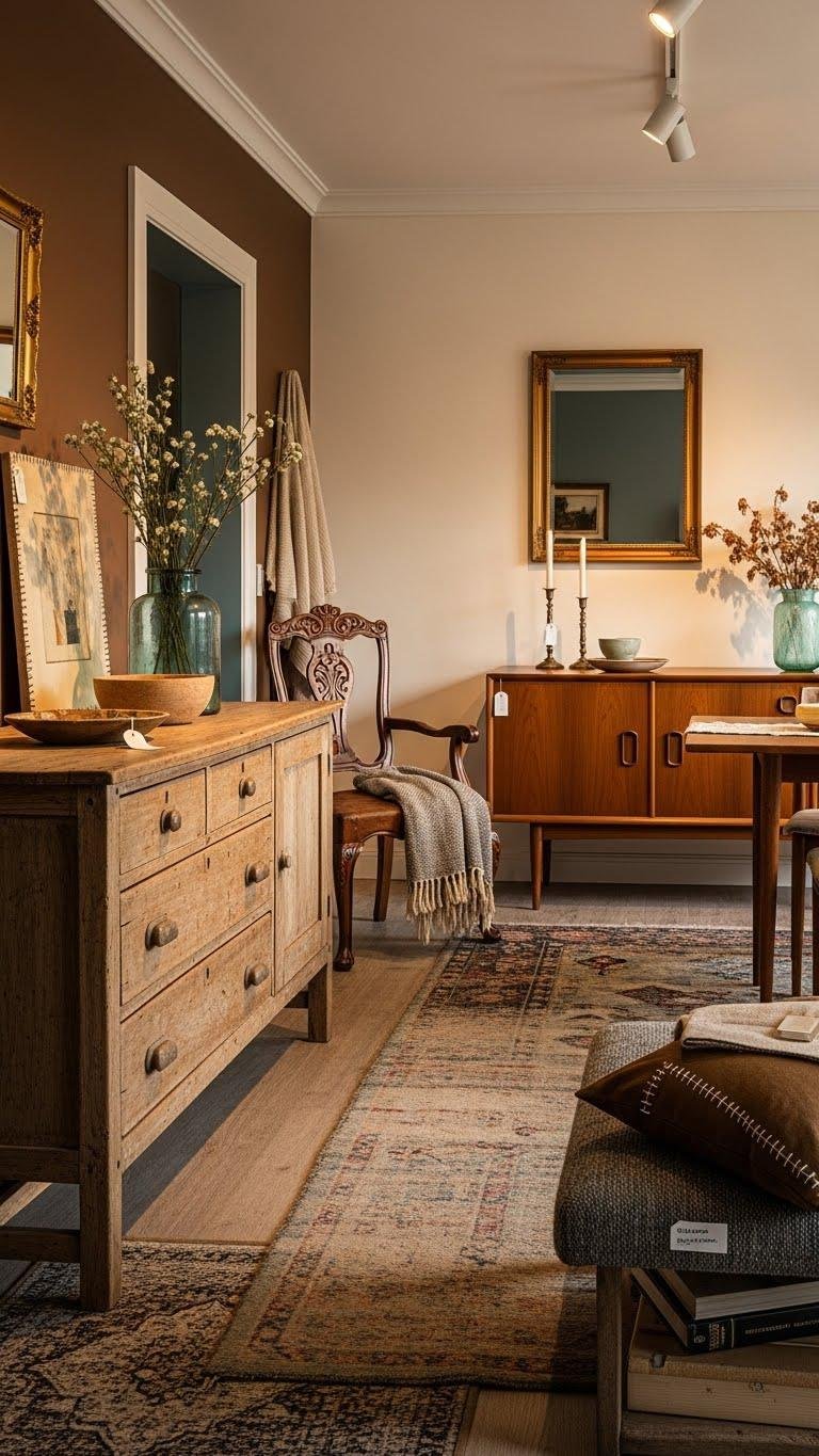 Though a piece may carry years, you’ll make it feel essential by placing thrifted or heirloom furniture where its story can speak—think a weathered dresser as a living-room console, a mid-century sideboard anchoring a dining wall, or a carved chair set as a cozy reading nook.