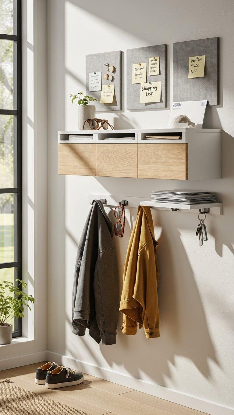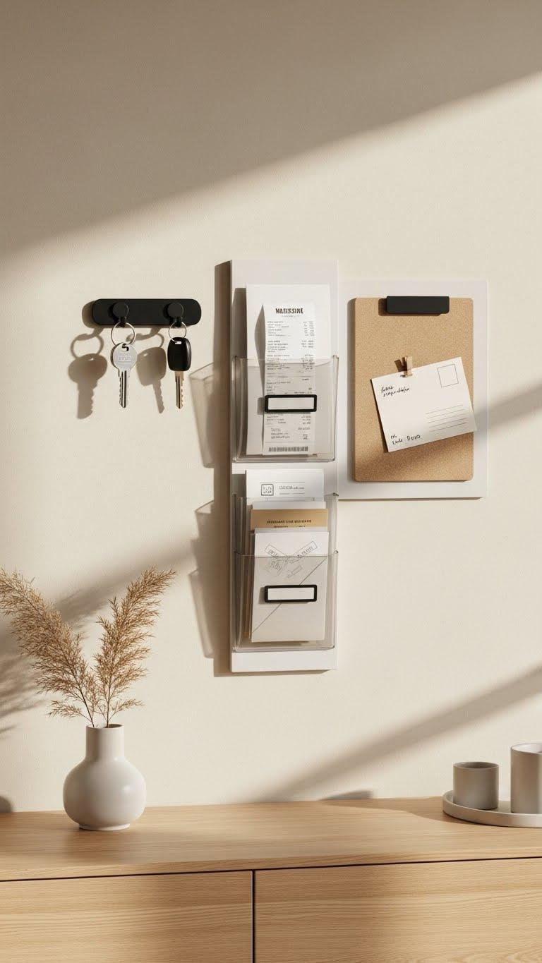 While you’re keeping surfaces minimal, wall hooks with integrated mail slots and slim shelves give you vertical storage that looks intentional and stays tidy.