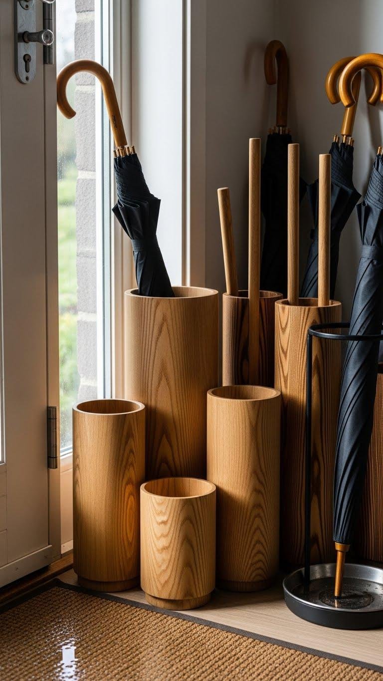 Tucked by the door, a wooden umbrella vessel gives you a sculptural spot to drop soggy umbrellas and walking sticks without sacrificing style. Choose handcrafted canisters or sleek parapluie stands in warm oak or charred finishes. You’ll appreciate the organized calm, visible texture, and quick grab-and-go freedom. Mix heights for visual rhythm and keep floors dry with a discreet drip tray.