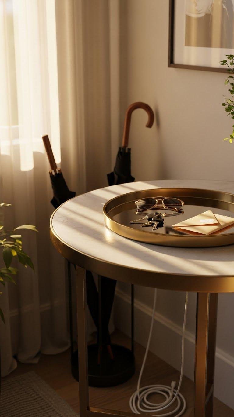 If your umbrella vessels mark a sculptural corner, a round console table with a tray centralizes function and form while keeping traffic flowing. You’ll appreciate its soft silhouette—drop keys, sunglasses, mail into brass trays for warmth or mirrored trays for sparkle. Keep lines clean, stash charging cords beneath, and let that circular surface act as a liberated landing pad that feels intentional, effortless, and tidy.