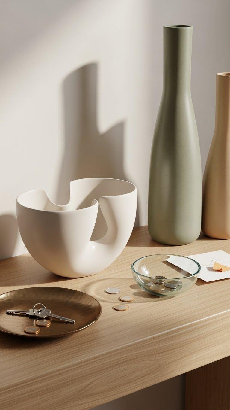 Lean into sculptural bowls as minimalist landing stations that double as art—choose organic shapes in matte ceramic, hammered metal, or translucent glass to catch keys, loose change, and a single folded note without crowding the entry.