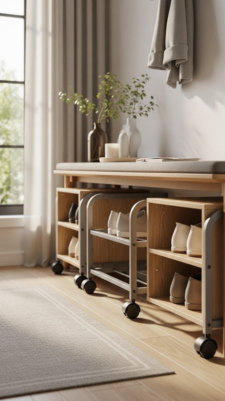 You’ll love rolling cubbylets for shoes and quick swaps; low profile trolleys tuck away instantly. Choose muted metals or warm wood, pair with slim wheels, and preserve a calm entry that feels free and effortlessly organized.