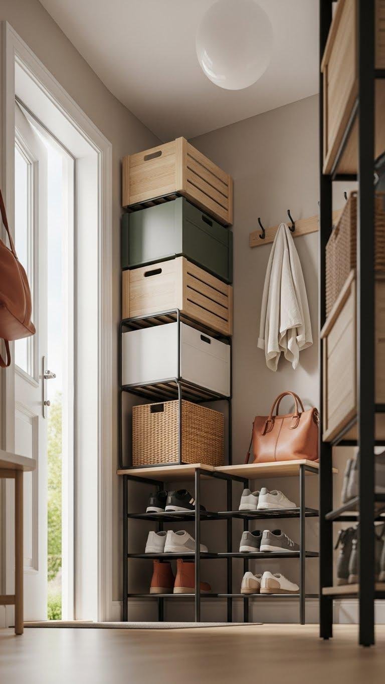 Maximize a tight entryway by stacking storage upward with tiered vertical racks that keep shoes, bags, and accessories off the floor without swallowing space. You’ll love modular stacked crates and sleek corner towers that draw the eye up, create openness, and organize essentials. Choose airy frames, mixed materials, and open shelving to maintain flow while freeing floors and your mind.