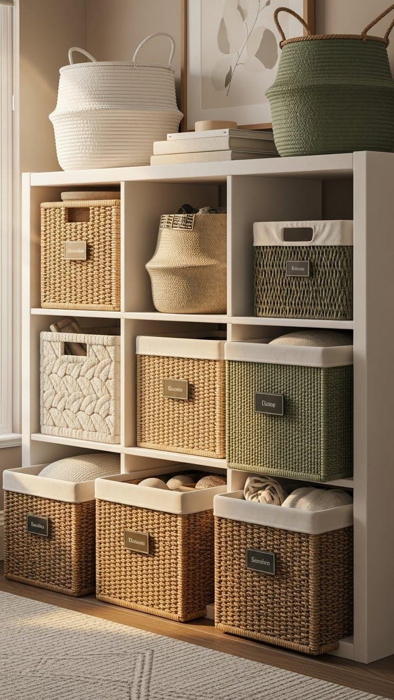 Pull-out handles keep access effortless, while varied sizes hide scarves, gloves, and small gear. This look feels airy and free, letting you stash clutter without sacrificing style or flow.