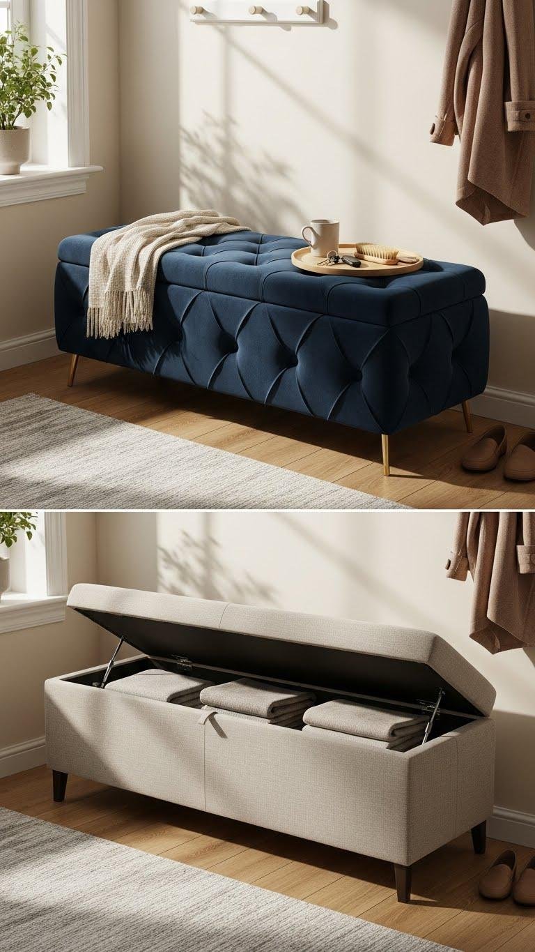 Bring seating and concealed storage together with an upholstered bench that’s tailored to your entry’s scale and style. Choose tufted ottomans for sculpted texture or sleek linen benches for airy minimalism. You’ll love hidden hinges that keep lids seamless and safe. Pair with a slim tray for keys and a brush for quick resets. It’s freedom-focused, tidy, and effortlessly chic.