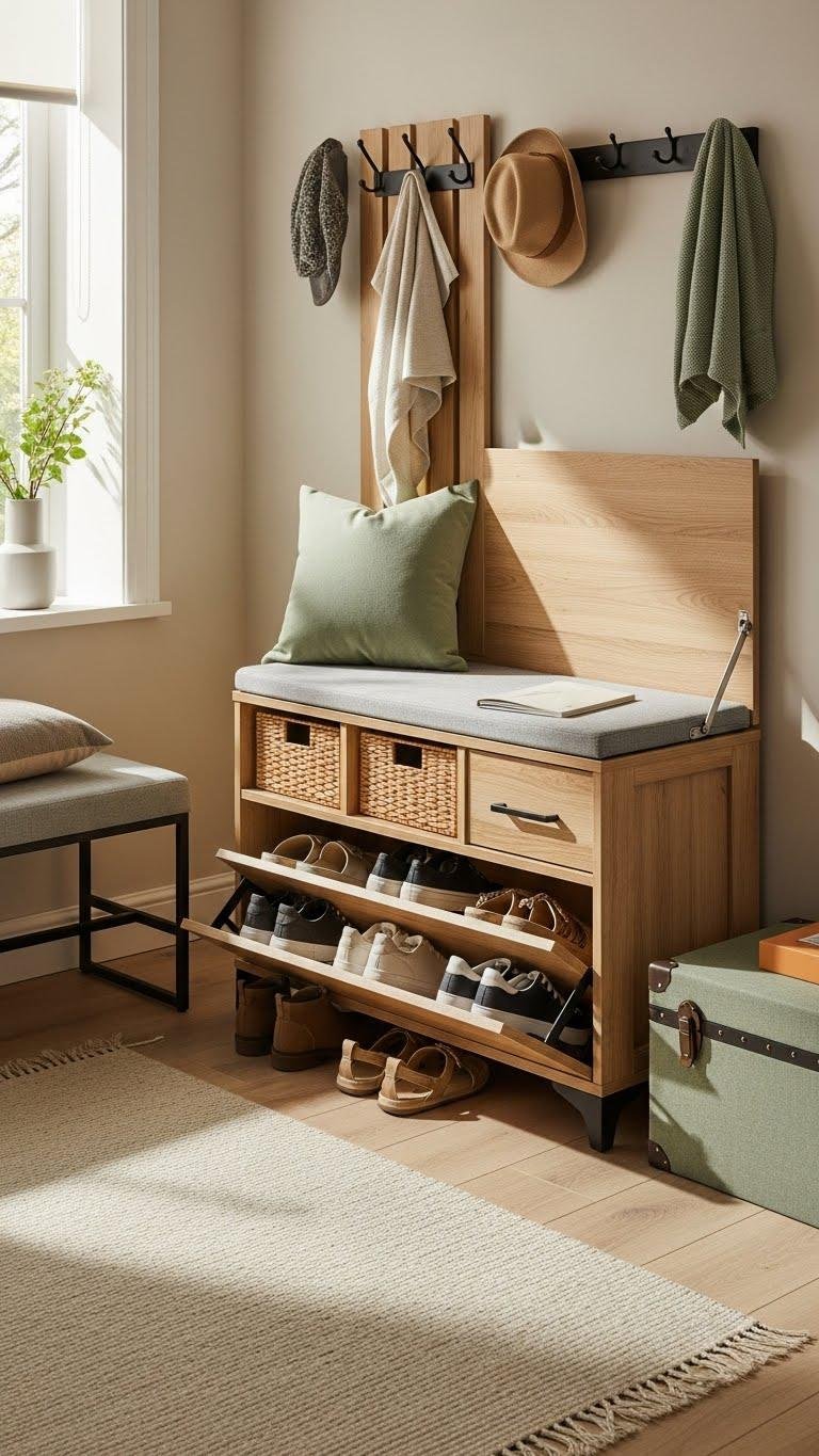 Opt for a shoe-storage bench that keeps footwear out of sight without sacrificing a comfy spot to sit—think slatted cubbies, pull-out drawers, or flip-top compartments paired with a cushioned seat so you can tie laces easily. Choose sleek bench ottomans or streamlined storage trunks to stash sneakers and sandals. You’ll gain tidy entryway style and the freedom to grab shoes and go.