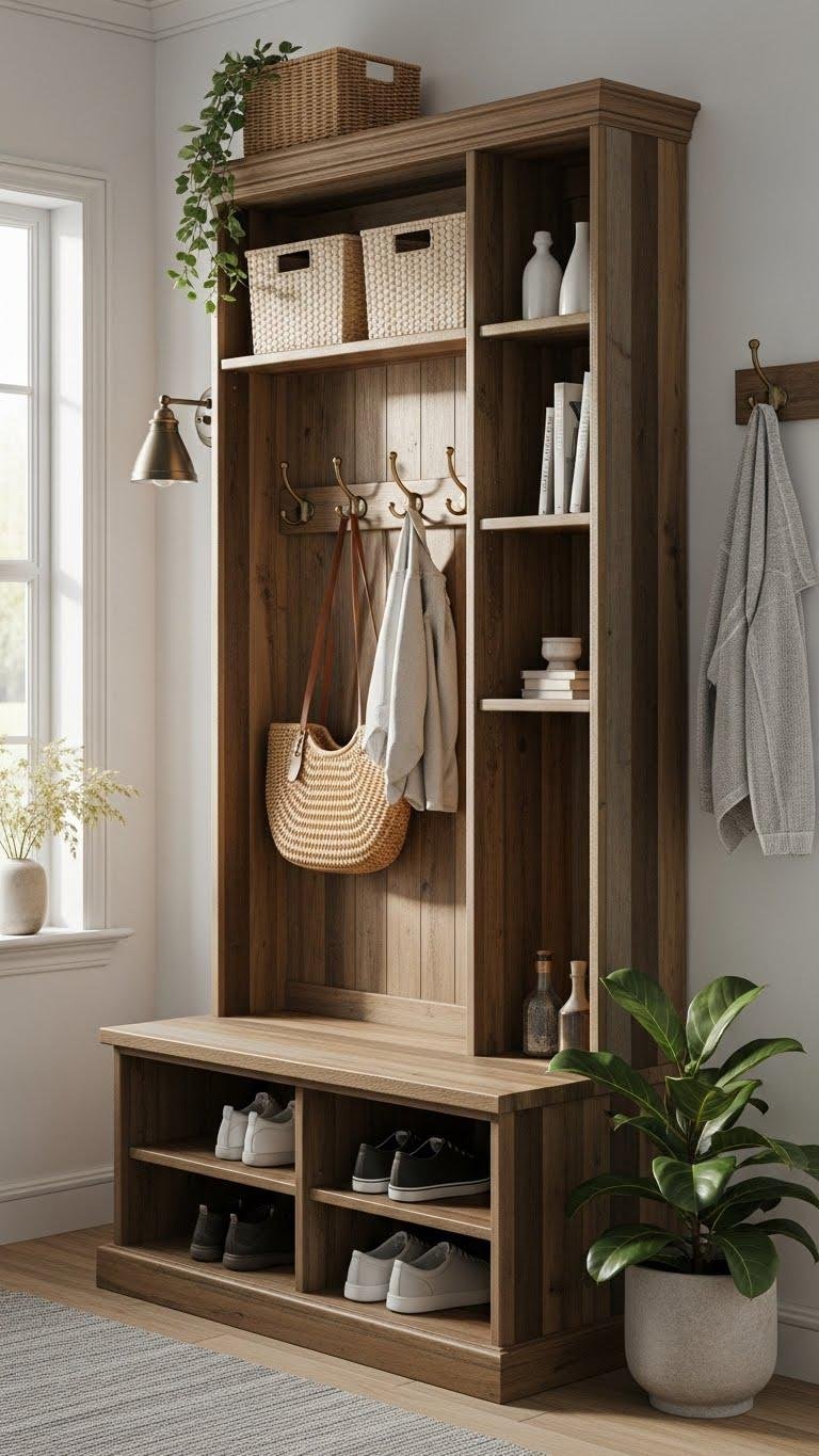 If you liked the idea of a shoe-storage bench, a hall tree takes that function further by combining a bench, hooks, and often shelving into one vertical statement piece. You’ll grab essentials, stash bags, and drop shoes without slowing your flow.