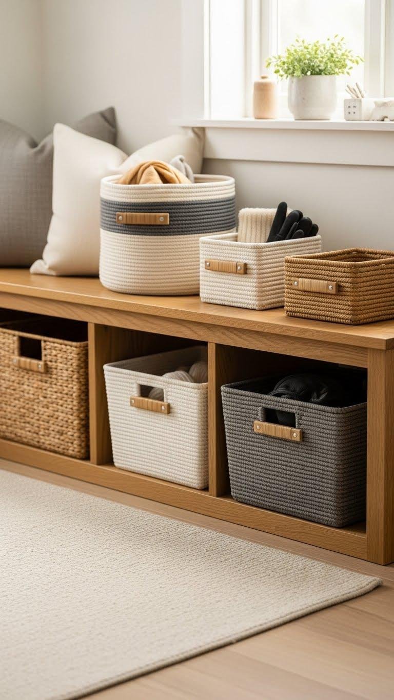 Slide woven baskets and bins under a bench to add instant texture and organized storage to your entryway. You’ll maximize bench clearance by choosing low-profile bins and matching woven textures to your decor.