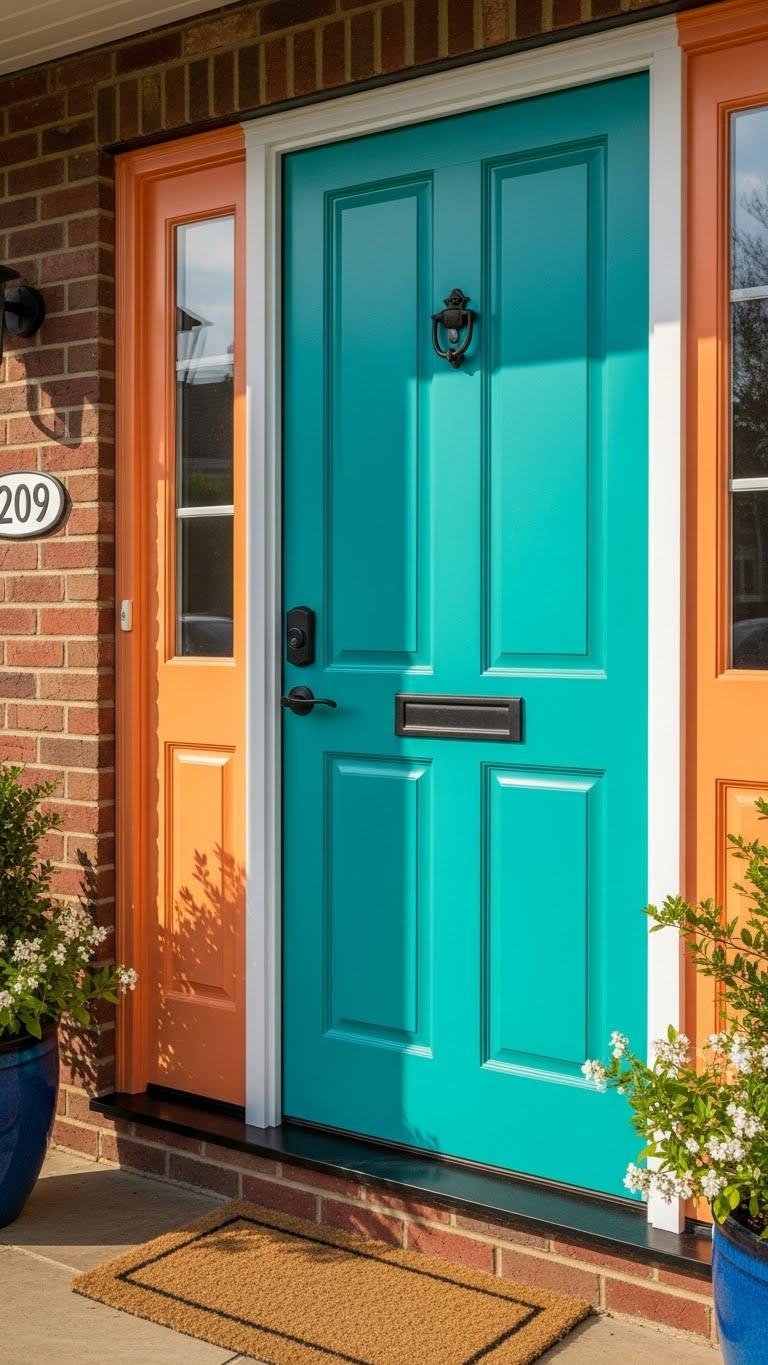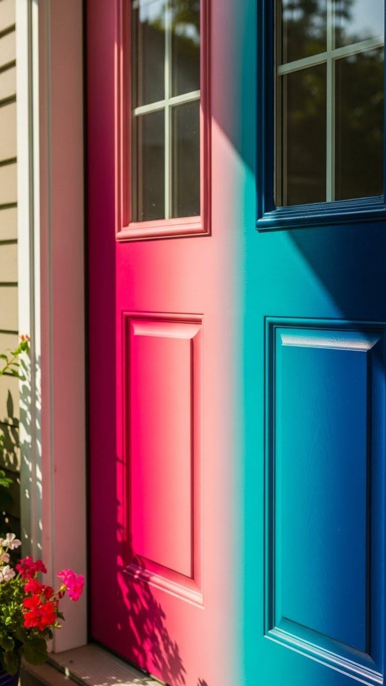 If your windows already spill color across the facade, let the front door answer with its own painted statement by using two-tone or omre finishes that echo or contrast the blooms. You’ll choose an ombre gradient for subtle flow or a bold two tone contraste for vivid separation. Pick durable exterior paint, test samples in sunlight, and trust your instincts to free your curb’s personality.