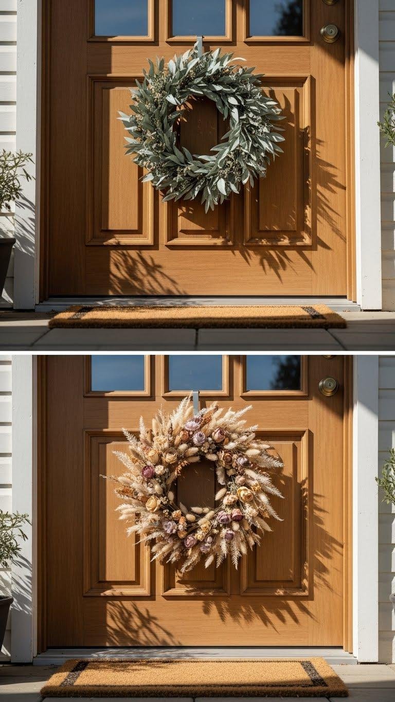 Choose a minimalist wreath with clean lines or a dried flower arrangement for low-maintenance charm. You’ll express personal style without clutter, swap seasonal accents easily, and let color, texture, and scale guide placement so the entrance feels deliberate and inviting.