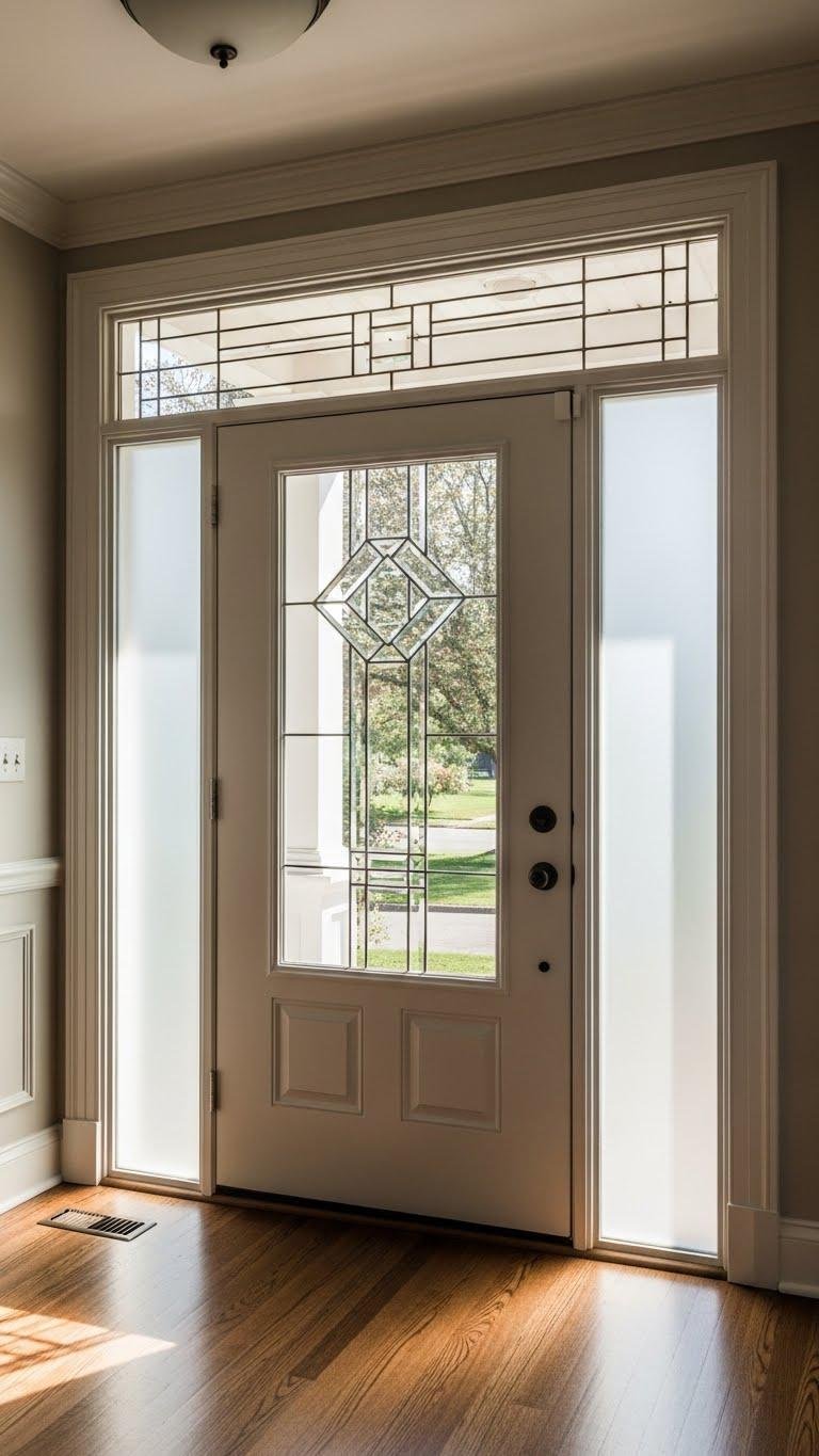 You’ll welcome natural illumination without sacrificing privacy by choosing stained glass accents or frosted sidelights. Pick simple geometric patterns and hardy glazing for low maintenance, visual interest, and a liberated, airy arrival every time you come home.