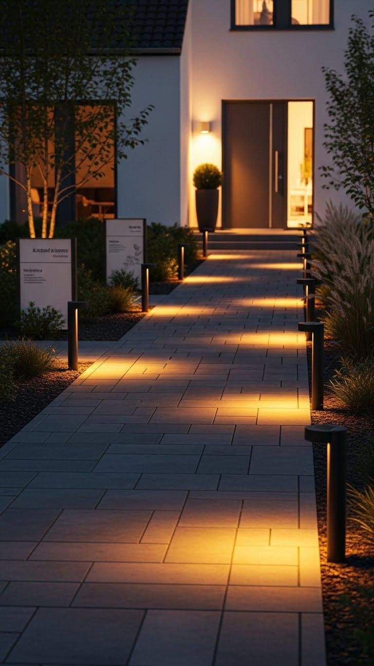 If you want guests to feel welcomed and safe before they reach the door, install pathway lighting that balances visibility with subtlety; low-profile fixtures and warm LED bulbs create a guided route without overwhelming the façade. You’ll place solar markers and discreet bollards to define edges, add minimal pathway signage for direction, and adjust angles to avoid glare—practical, elegant, and freedom-friendly guidance.
