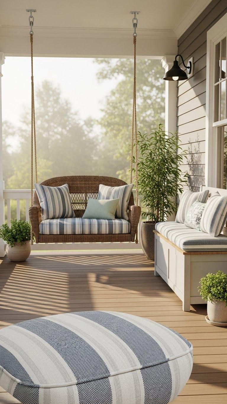 Anchor a porch swing or bench to create an instant sitting nook that invites lingering and adds architectural interest to your entry. You’ll choose a sturdy wicker swing or a compact striped bench, add weatherproof cushions and throw pillows, and secure anchors or brackets. Aim for breathable fabrics, easy-clean covers, and balanced proportions so your porch feels effortless, open, and welcoming.