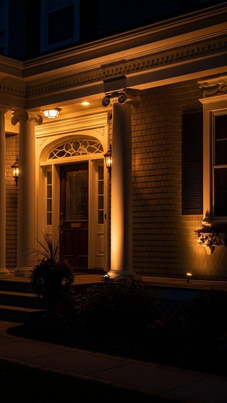 Use focused spotlights to draw attention to your porch’s best architectural details—columns, trim, textured siding, or a decorative door surround—so they become focal points after dark. You’ll position low-profile fixtures for up lighting drama, balance angles to create intentional shadow play, and choose warm LED bulbs. The result: a bold, liberated curb appeal that highlights structure without overpowering the entry.