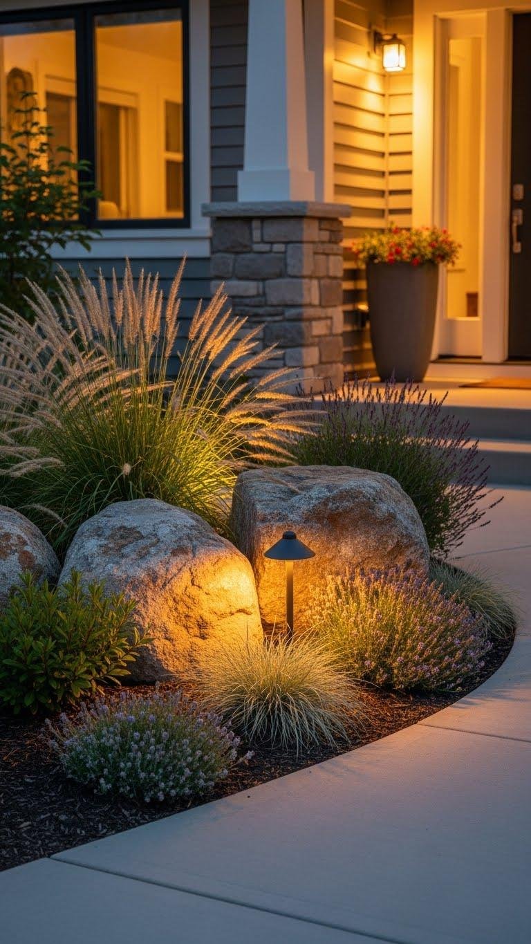 Place a few boulders to anchor beds, then plant flowing grasses and native shrubs to soften edges. A minimalist rock garden paired with cascading foliage creates low-maintenance movement, tactile contrast, and a welcoming, free-spirited curb appeal you can maintain easily.