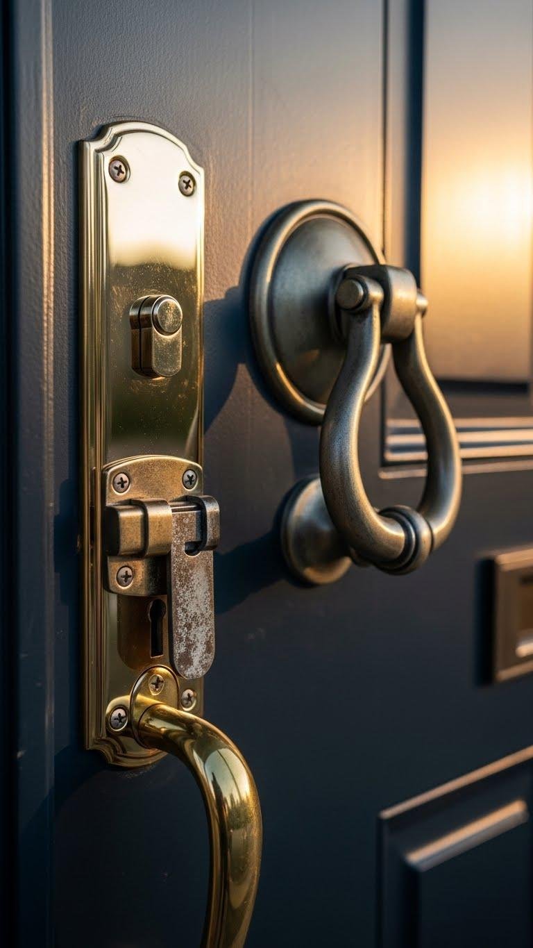 Choose a polished backplate and decorative screws for crisp lines, pair with an antique latch for tactile charm, and mount an oversized knocker to make arrivals feel intentional.