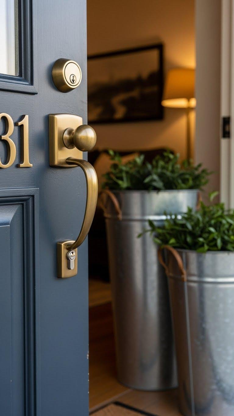 Swap hardware, house numbers, and planters to antique brass accents or oil rubbed bronze for a unified, lived‑in look.