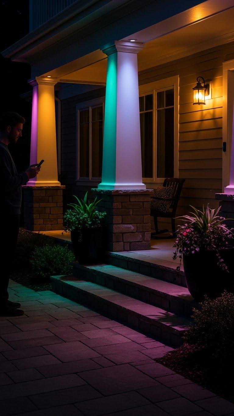 You’ll use smart bulbs and bluetooth strips to wash columns, steps, and planters. Program color scenes and mood presets for evenings, parties, or calm nights.