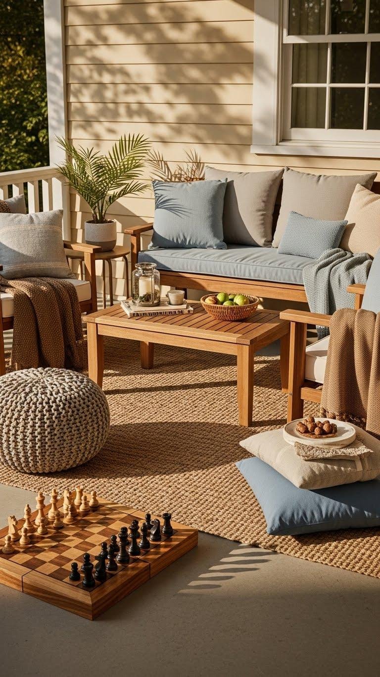 When you set up seating on the porch, think of it as arranging a small living room outdoors: pick pieces that invite lingering—a pair of deep-seated chairs or a cushioned bench—then anchor them with a durable rug and a low table for drinks and books. Add a knitted pouf, a porch chessboard for slow afternoons, layered throws, and weatherproof cushions so you can relax freely.
