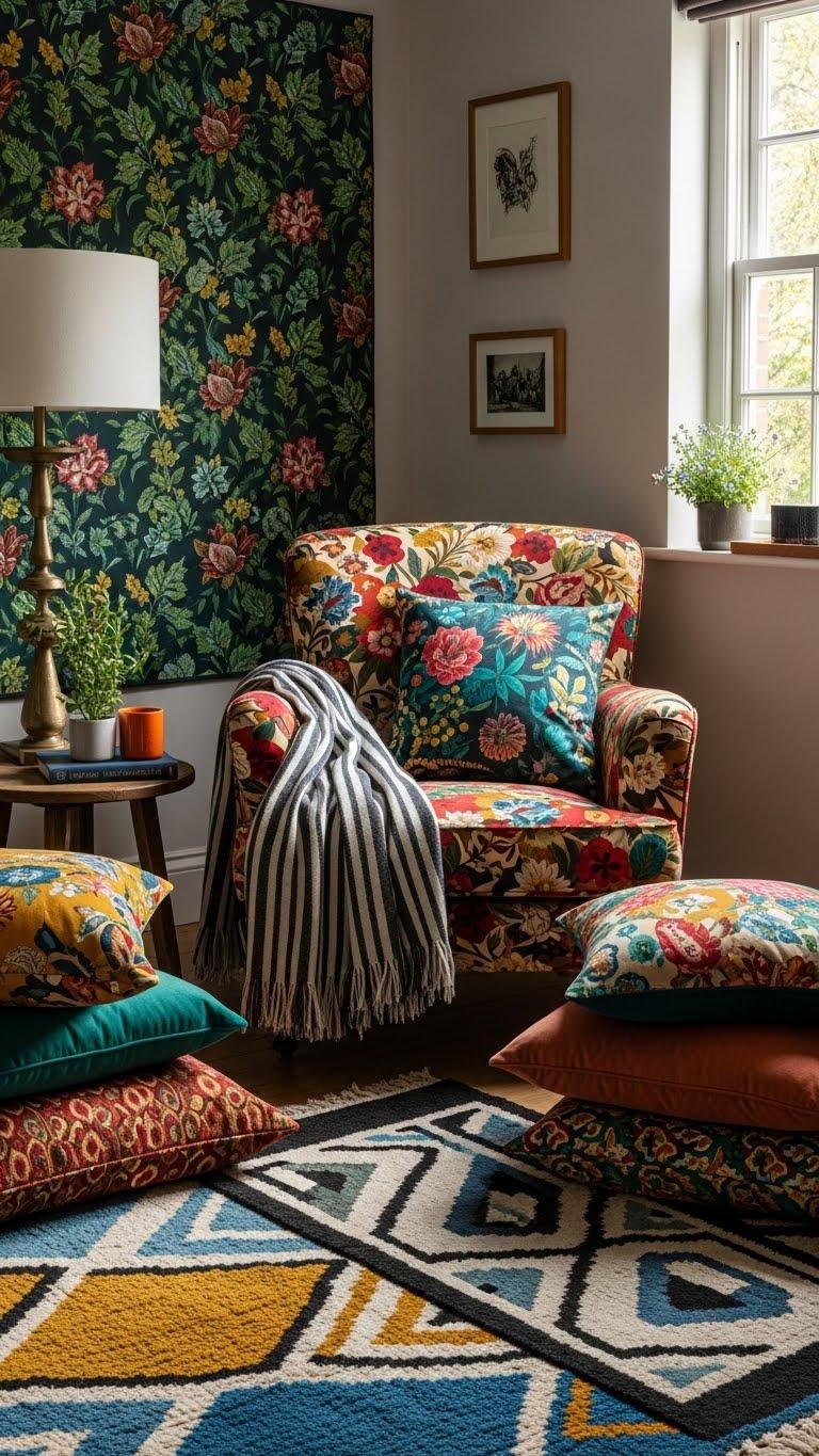 Once you’ve let a single vintage maximalist piece set the room’s personality, layer bold patterns to create a curated, lived-in look that feels intentional rather than cluttered.