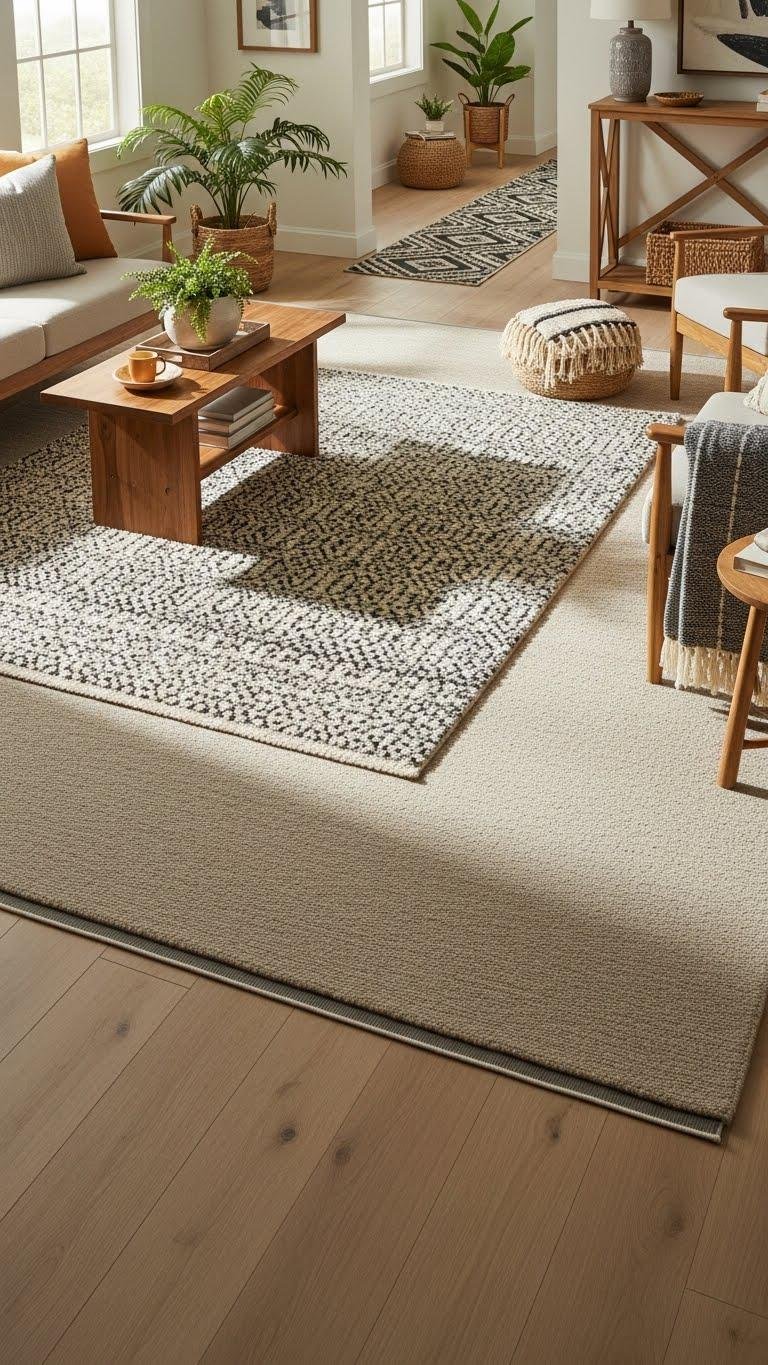 When you layer rugs, you instantly define zones and add tactile depth without reworking furniture placement; start with a large, neutral foundation rug and top it with a smaller textured or patterned piece to create contrast, anchor seating, and soften hard floors. You’ll add a soft rugpad beneath for grip and cushioning, then use a patterned runner to guide traffic and inject personality while staying effortlessly free.