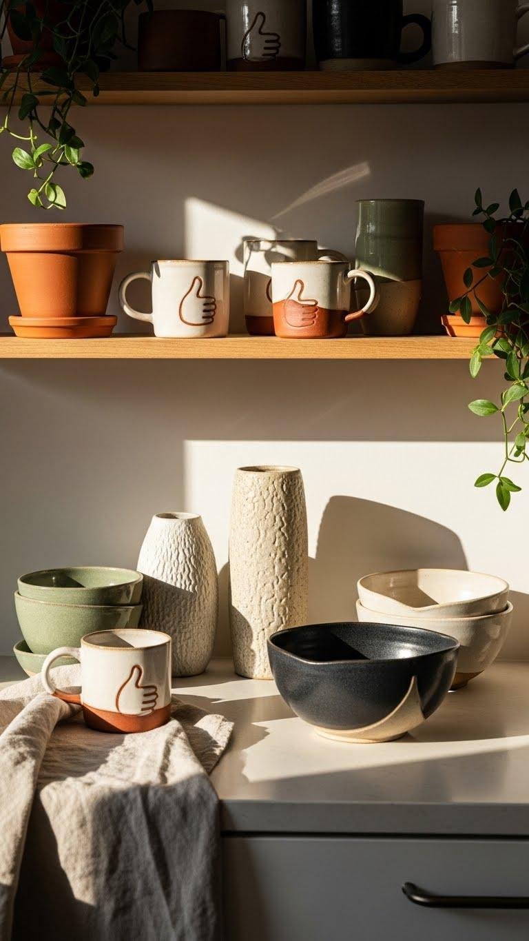 Mix handbuilt mugs and textured vases across shelves and countertops to create curated imperfection.