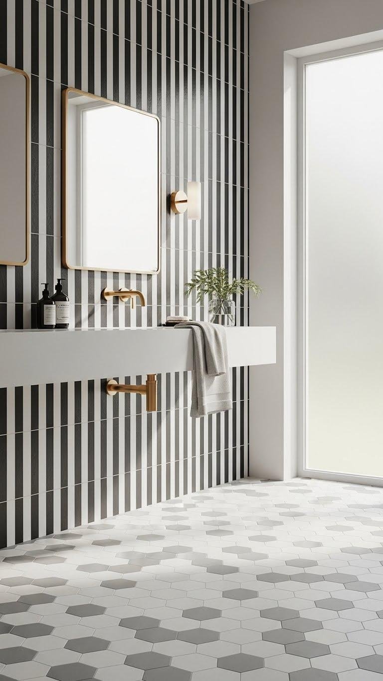 Choose a bold monochrome stripe for a modern, liberated feel or a subtle hexagonal pattern for texture. Lay tiles vertically to heighten walls, or create a statement floor that reads like art without sacrificing calm.