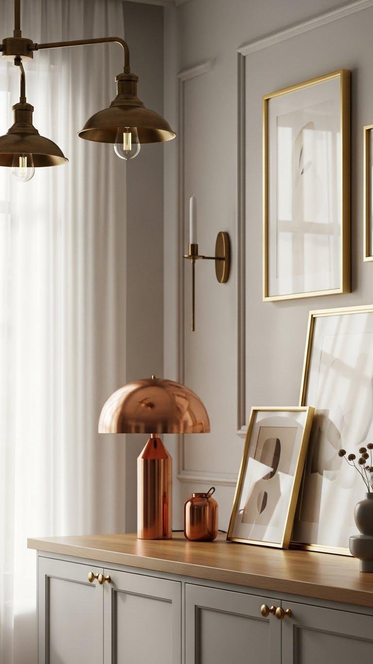 Introduce warm metals to instantly lift a room’s depth and personality without overpowering your palette. You’ll layer antique brass fixtures, burnished copper accents, and subtle gold tones to create warm contrast and visual richness. Mix small hardware, lighting, and art frames to guide the eye and reflect light. Use restraint—strategic placements give rooms sophisticated warmth while preserving airy freedom and flow.