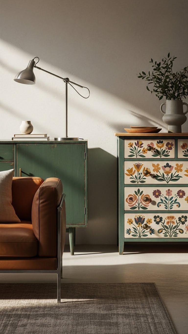 Layer handpainted furniture into your scheme to bridge vintage character with contemporary lines—think a distressed midcentury sideboard refreshed in a matte jewel tone or a farmhouse dresser adorned with folk-inspired florals. You’ll mix eras confidently, pairing handpainted dressers with sleek modern seating, introducing eclectic finishes as focal acts.