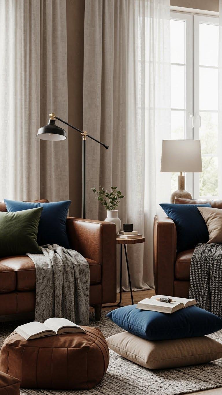 You’ll mix rugged leather sofas with airy linen curtains, add velvet pillows for luxe contrast, and punctuate scenes with suede accents and woven throws.