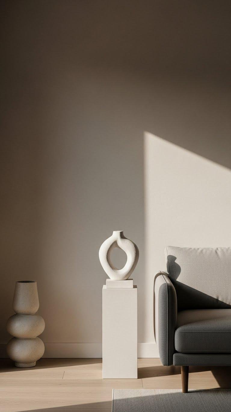Choose a minimalist sculpture that matches your vibe, play with scale contrast to command attention, and mix tactile ceramics for warmth.
