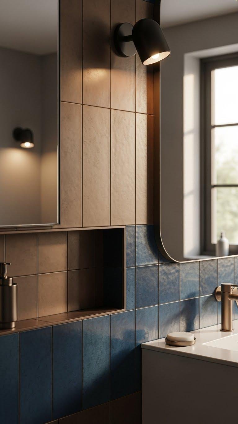 Introduce copper or blue ceramic tiles to give your bathroom a modern, tactile identity that balances warmth and cool sophistication. You’ll choose matte finish pieces for restrained elegance, pairing them with durable handmade grout to emphasize artisanal texture.
