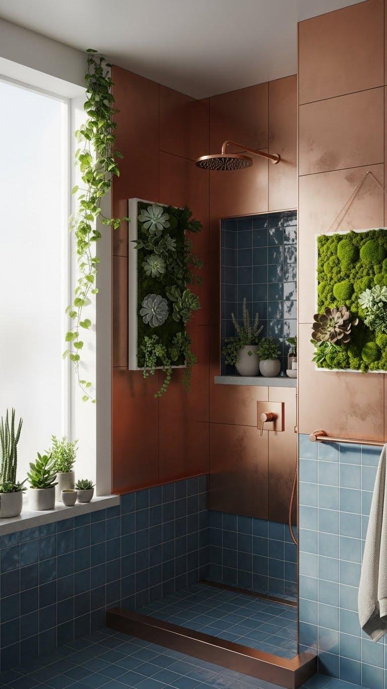 After anchoring a bathroom with matte copper or cerulean tiles, soften the look by adding living plants that echo those warm and cool tones.