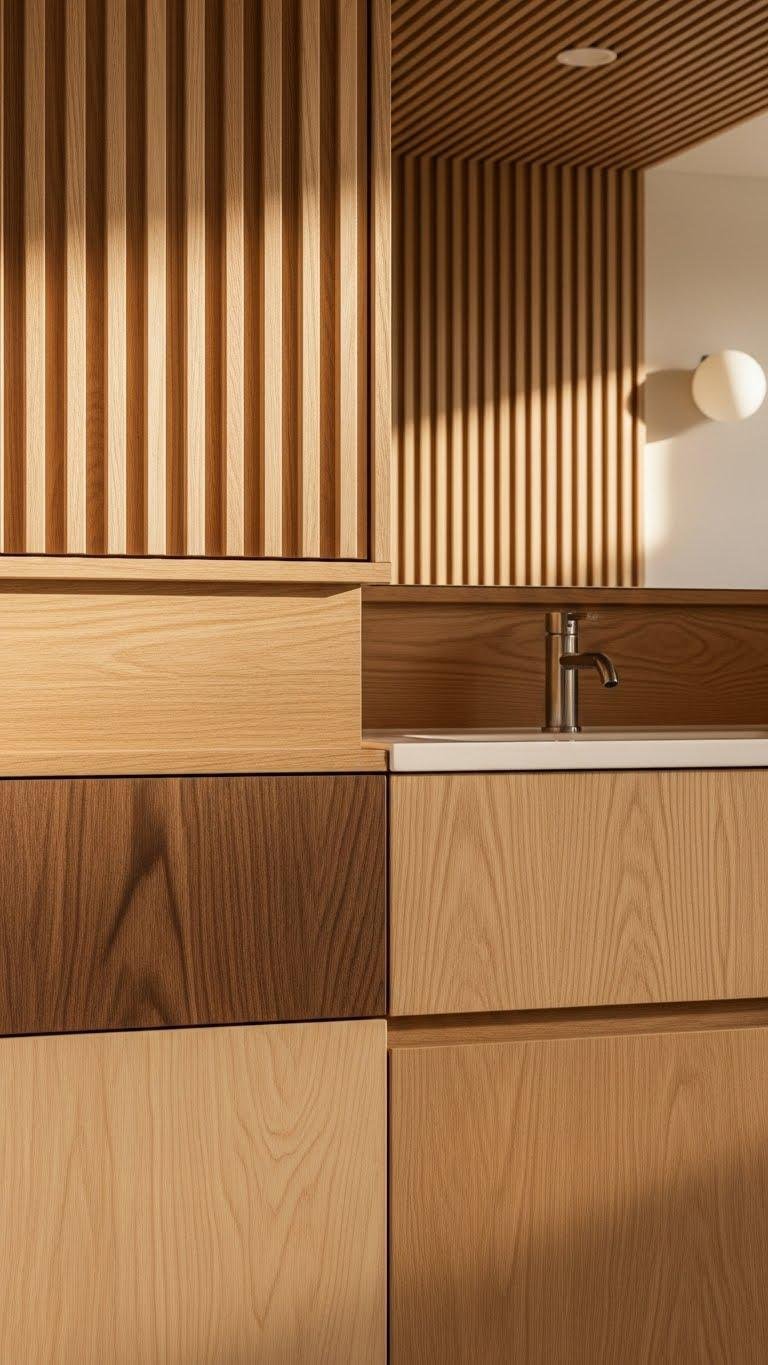 Often you’ll find that fluted wood softens a sleek scheme while adding tactile rhythm—think cabinet fronts, bath panels, or vanity faces carved with narrow vertical grooves that catch light and shadow. You’ll balance a fluted ceiling with wooden wainscoting to create warm, layered architecture. Choose simple stains, bold scale, and clean joinery so rooms feel liberated, tactile, and timeless without fuss.