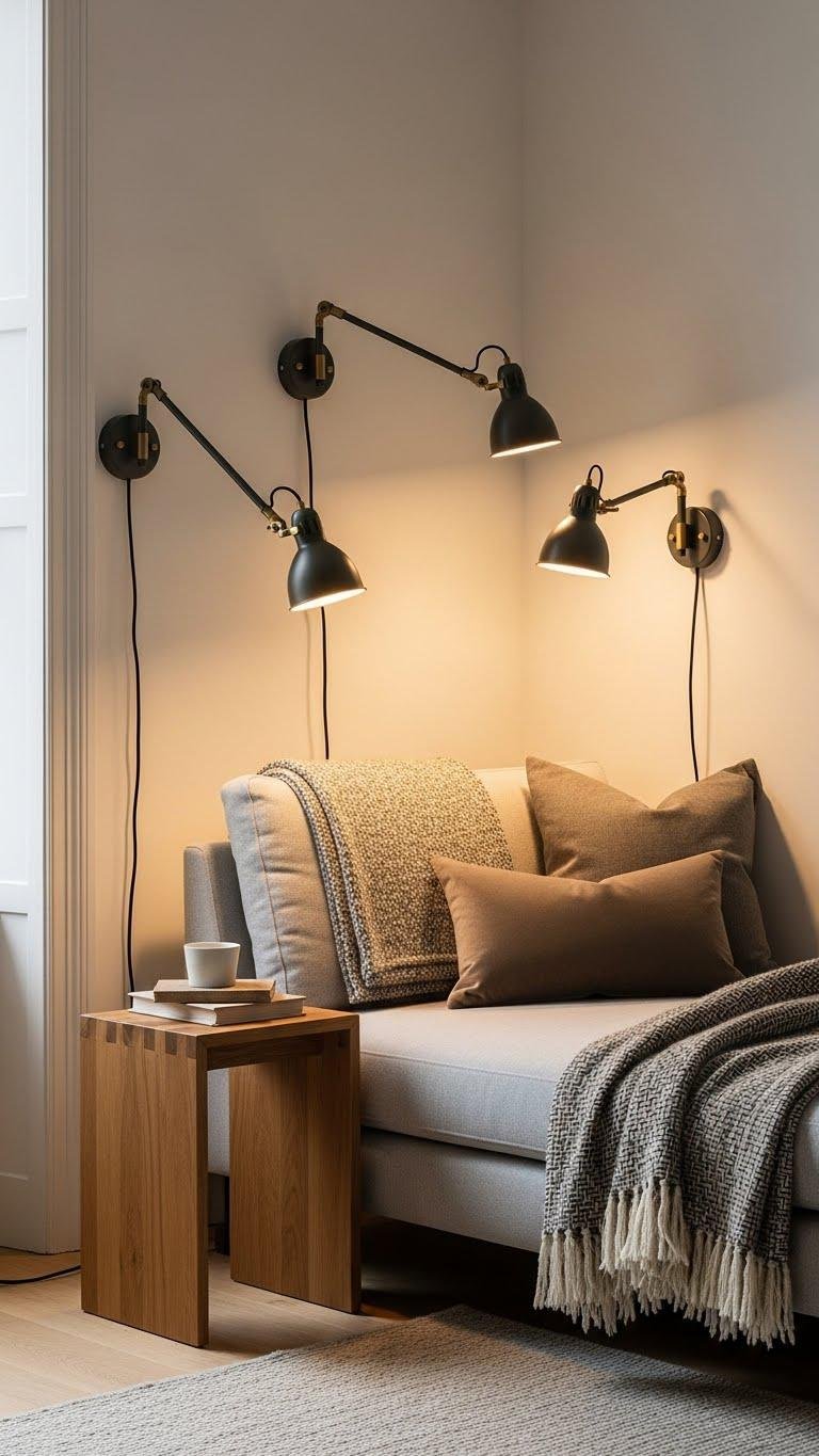 Position a cozy chaise, add a small side table, and mount adjustable sconces for layered, glare-free light.