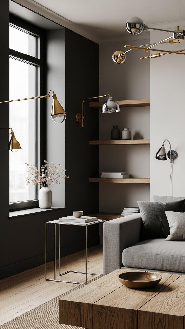 When you layer matte-painted walls with polished metal accents and warm natural wood, the room reads as intentionally modern and comfortably lived-in; the matte backdrop mutes glare so metal details pop and wood tones add human scale.