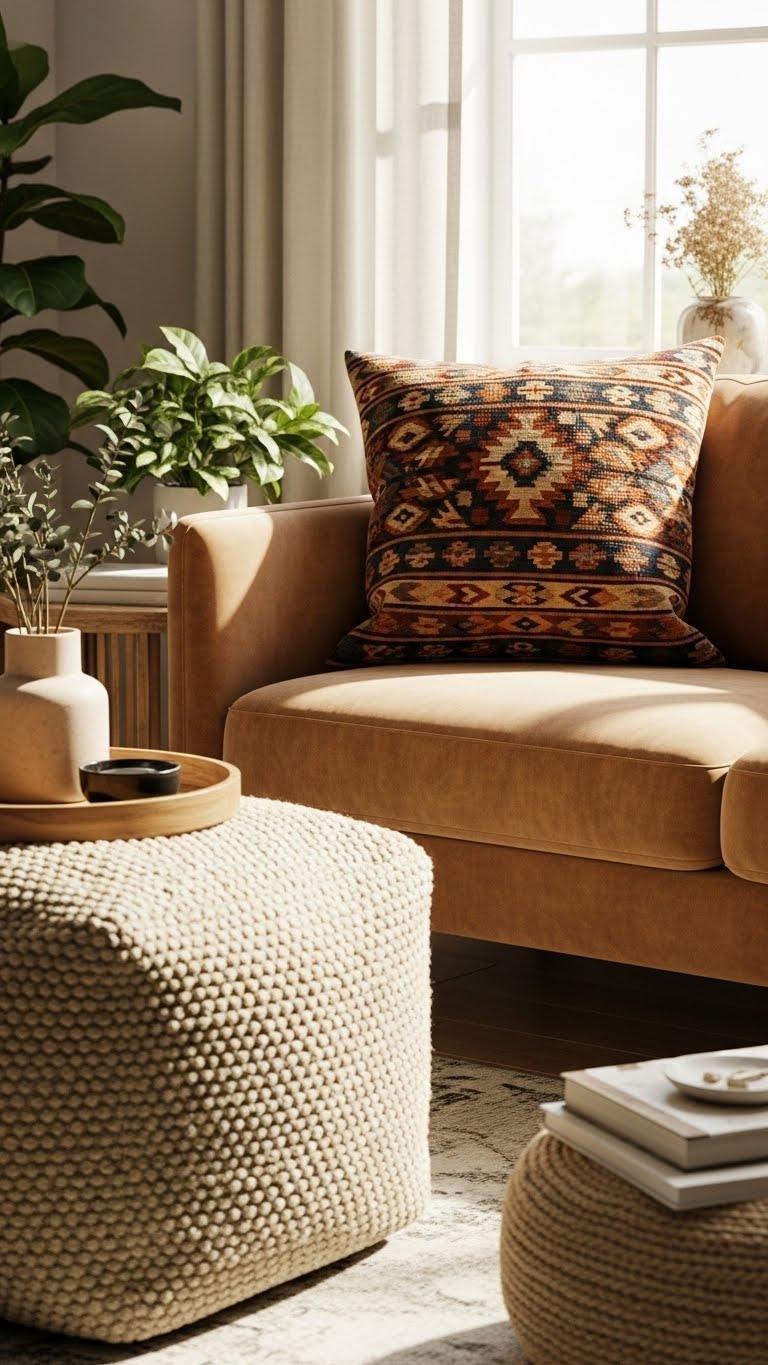 A handful of contrasting textiles—bouclé, velvet, and kilim—will instantly give your room depth and deliberate texture. Mix a bouclé ottoman with a low-sheen velvet sofa and patterned kilim pillow for scale tension that feels curated, not forced.