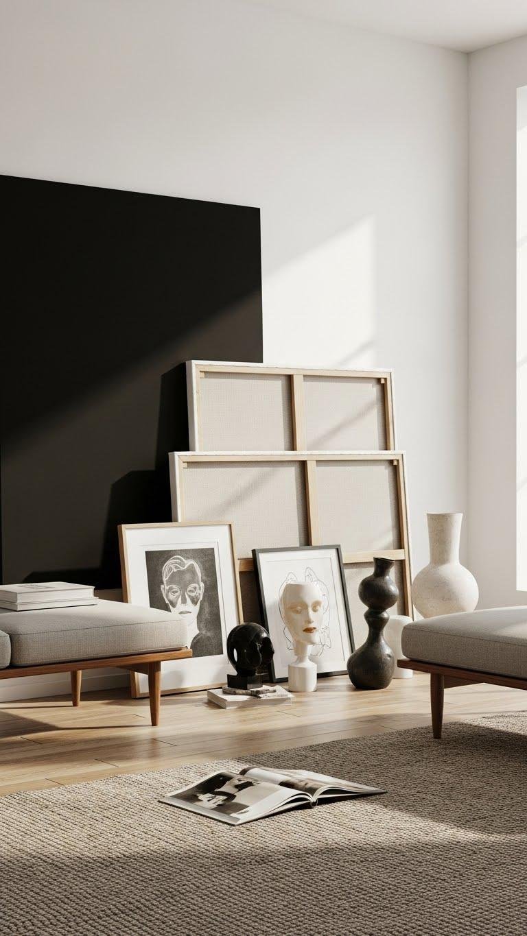 Let pieces overlap slightly, lean at varied angles, and keep surrounding furniture low so art breathes and your space feels free and modern.