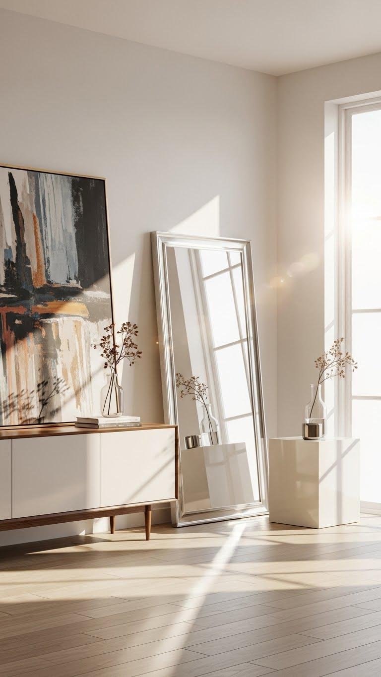 Leaning large-scale art brings depth, but you can magnify that light and space by introducing reflective surfaces that bounce sunlight and add polish. Add a mirrored accent to catch views and double brightness, pair with glossy surfaces on side tables or a low credenza, and keep lines simple.