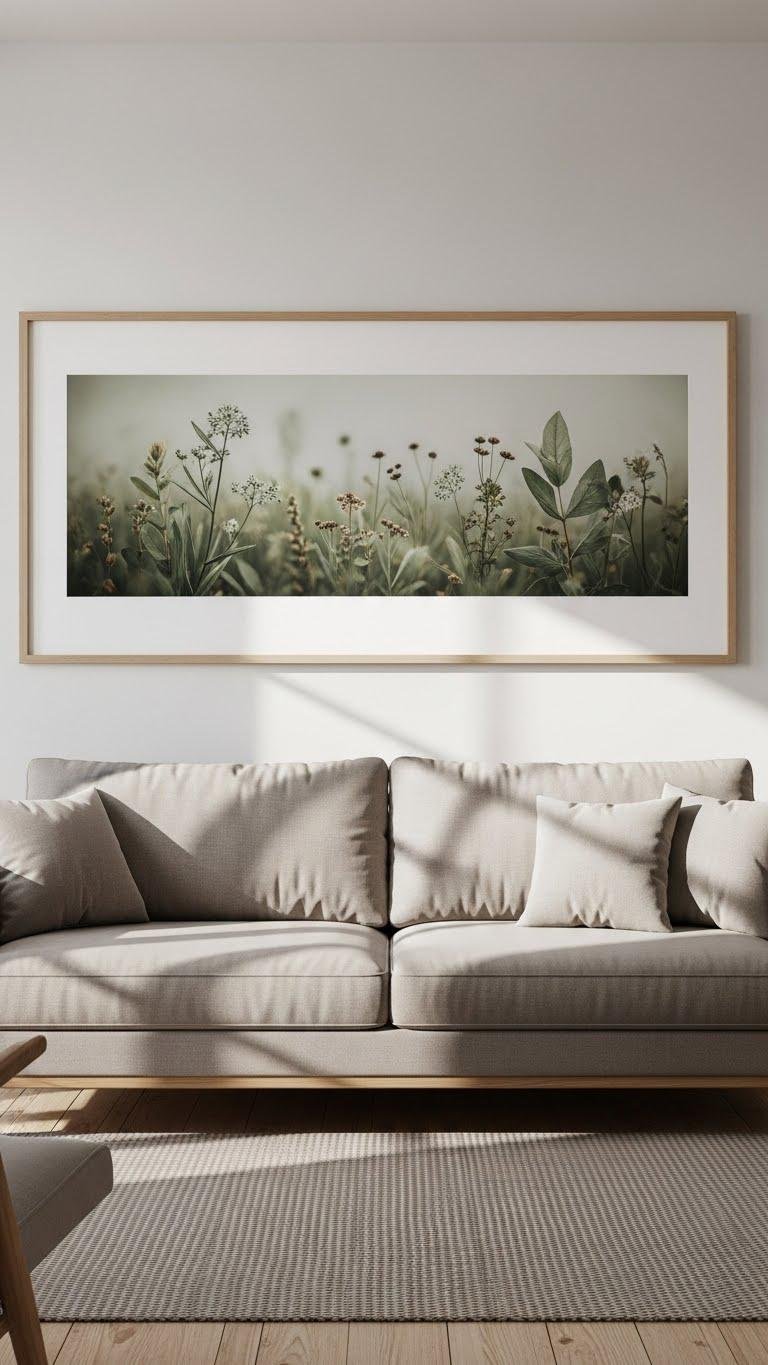 Large frames let muted palettes sing without shouting, anchoring seating areas and creating a serene vista.