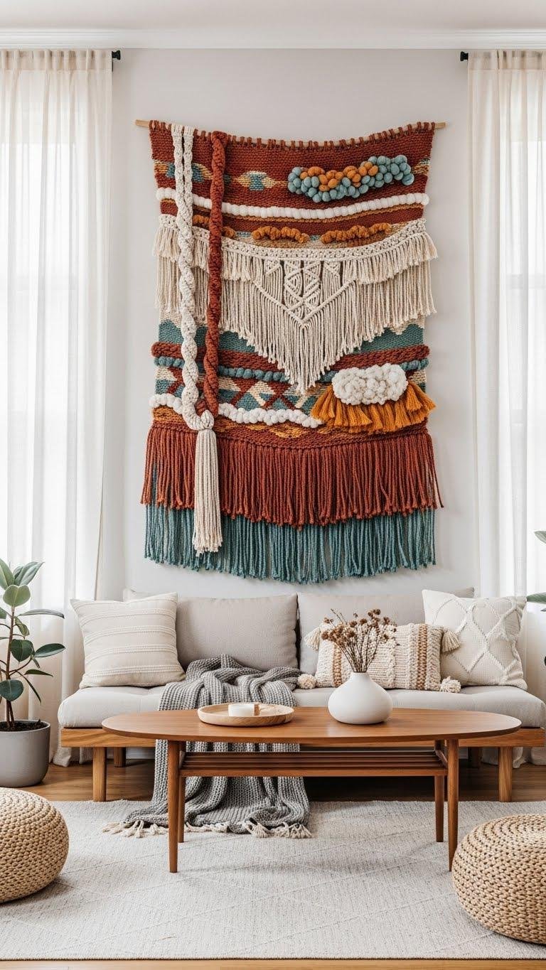You’ll choose handwoven textures that invite touch and create depth, letting boho layers float without clutter. Hang it high to free the room’s energy, anchor seating with color, and let the piece declare a calm, adventurous spirit.