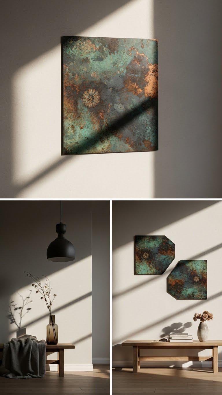 Because metal ages with character, a patinated accent panel brings lived-in elegance and visual weight to a room without shouting. You’ll choose a surface where patina chemistry and controlled heat treatment create deep, unpredictable tones that feel authentic. Mount it as a solitary statement or paired geometric pieces, letting tactile aging and muted metallics free the space while anchoring your aesthetic with confident restraint.