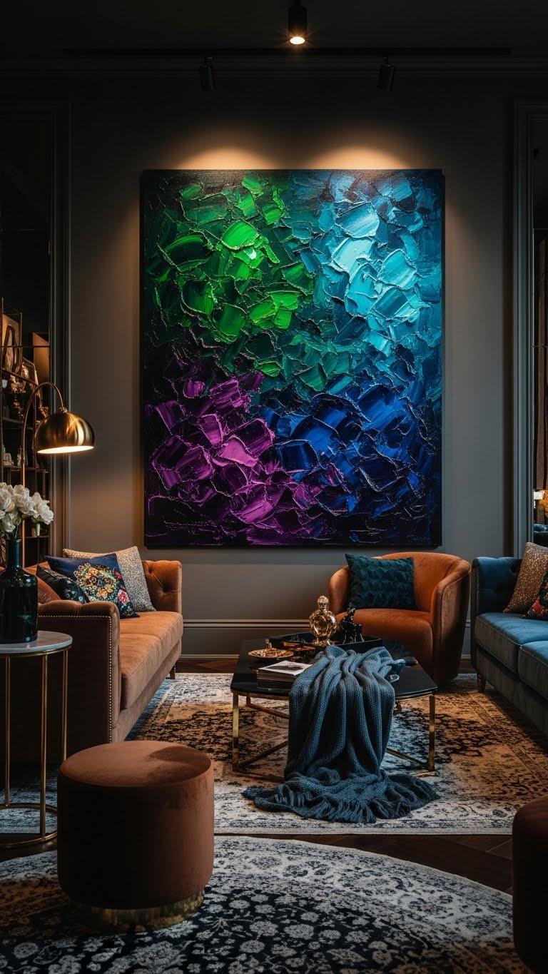 Think-piece energy meets vibrant bravado in a maximalist jewel-toned canvas that commands the room; you’ll anchor your living space with rich emeralds, sapphires, and amethysts layered in confident, textured strokes. You’ll pair velvet palettes and opulent textures to create bold contrast, letting statement art free your decor choices. Embrace scale, layered color, and unapologetic drama for a liberated, luxe focal point.