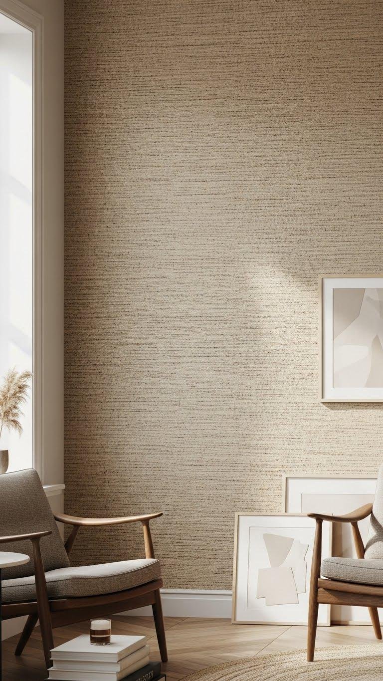 Textured grasscloth wallpaper brings tactile warmth and artisanal depth to a living room, turning a plain wall into a refined focal point.