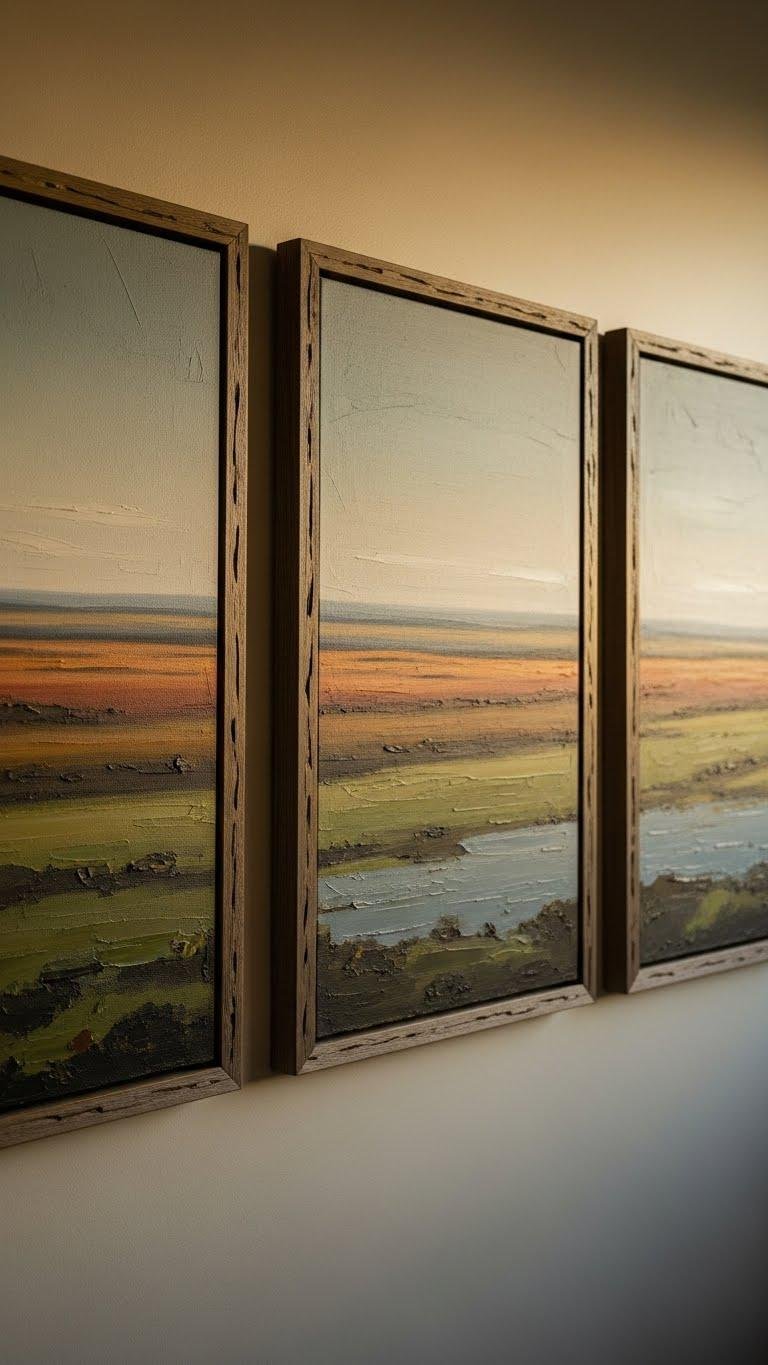 If you want to anchor a room with warm, lived-in character, a rustic landscape triptych delivers that grounding with clean visual drama. You’ll choose weathered frames and muted palettes to evoke horizon-wide calm without fuss. Hang panels slightly apart for rhythm, let natural light reveal texture, and pair with simple furnishings so the scene breathes — freedom framed, intentional, arresting.