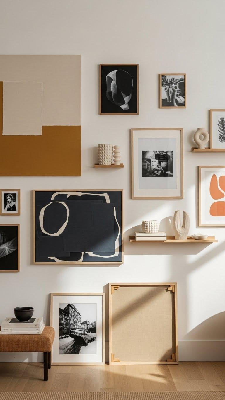 Often you’ll want a curated gallery wall to act as the room’s personality hub—mixing scale, media, and frame styles so the arrangement feels intentional, not cluttered.