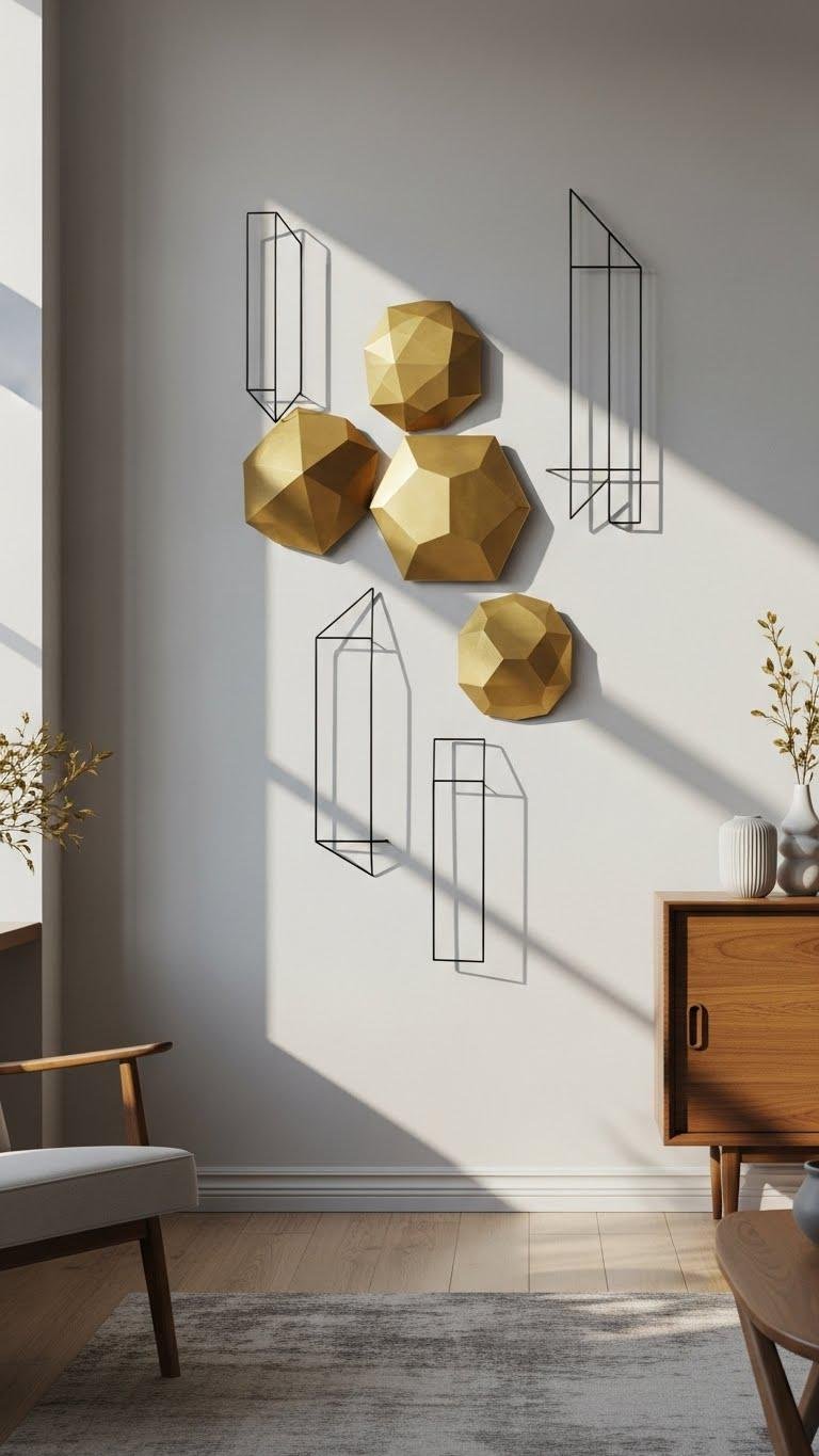 Anchor your living room with geometric metal wall sculptures that bring clean lines, dimensional shadow play, and architectural calm to the space. You’ll choose Brass polygons for warmth and Minimalist wireframes for airy structure, arranging pieces to guide sightlines without clutter. They free the room visually, create movement through light and shadow, and let you curate a bold, disciplined focal point that feels liberating.
