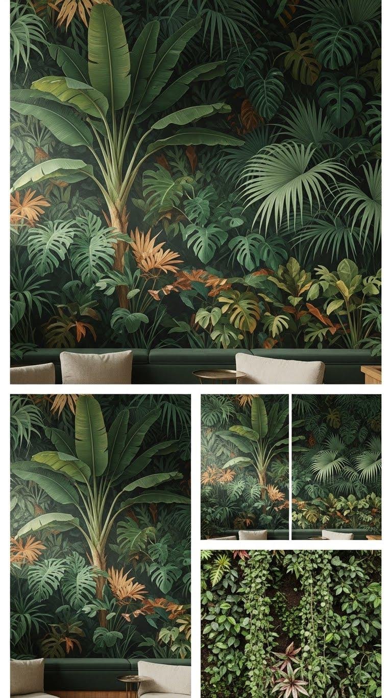 You can choose Tropical foliage patterns as Botanical wallpaper, a dramatic Split panel mural, or a tactile Living wall. Each option liberates the space, anchors seating, and invites calm adventure.